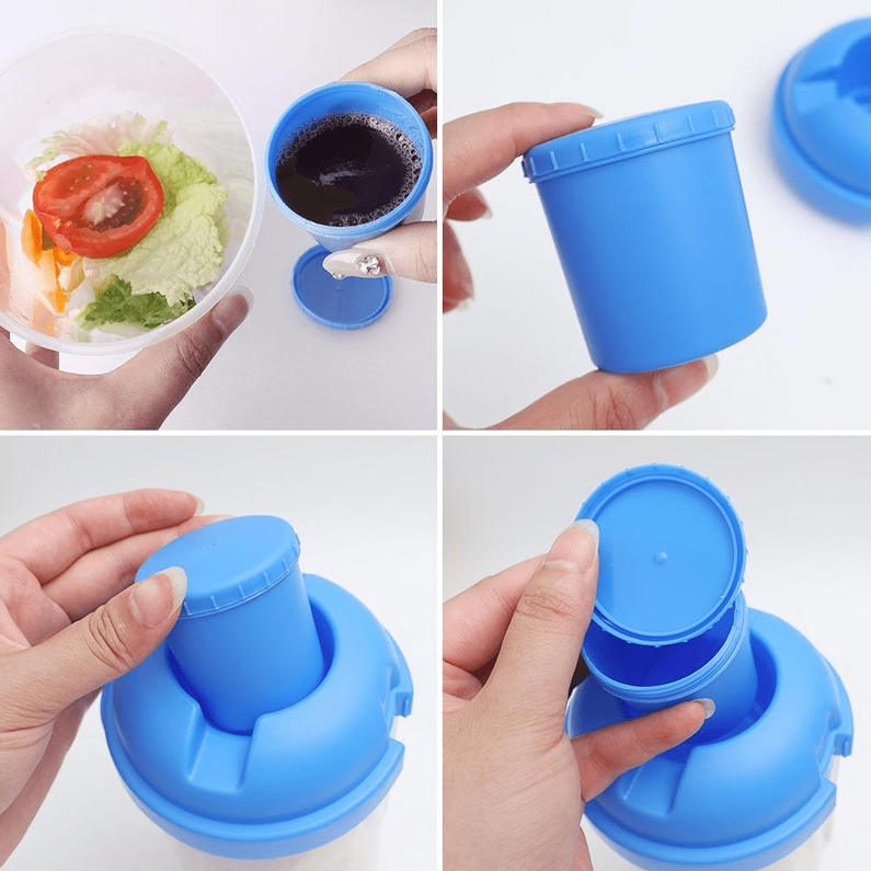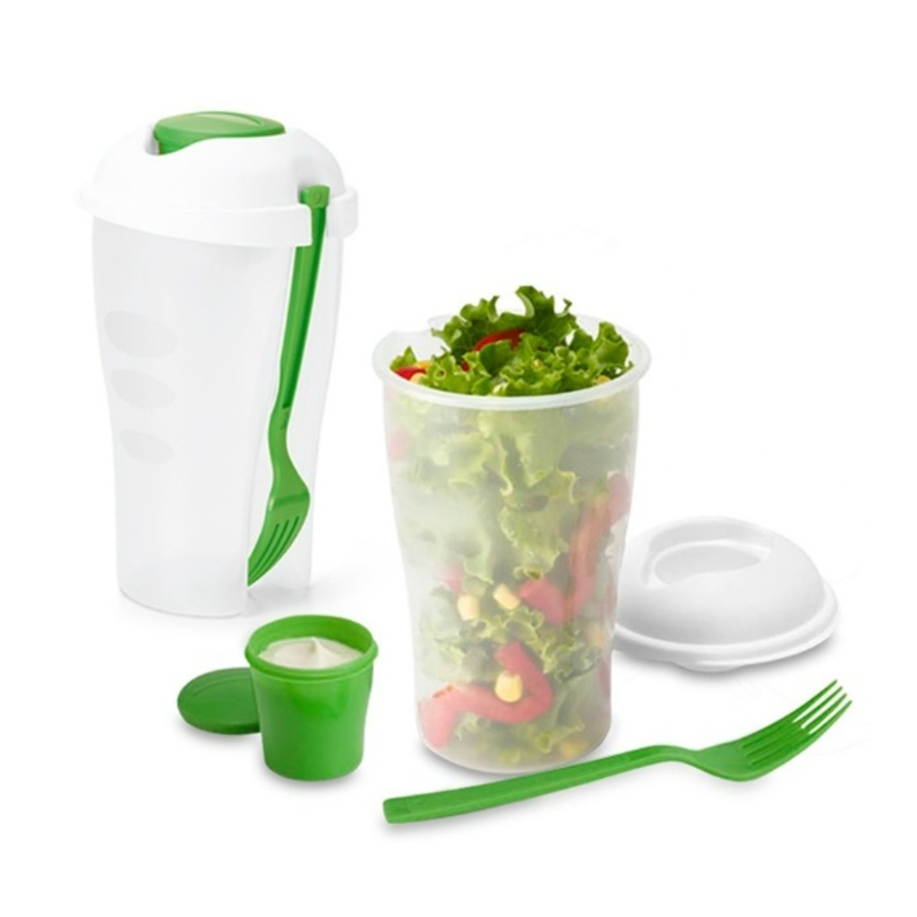 E não precisa se preocupar com vazamentos, pois o compartimento superior para molhos possui fechamento seguro. Além disso, o porta salada vem com garfo, que se encaixam na lateral do copo, tornando ainda mais prático de transportar.